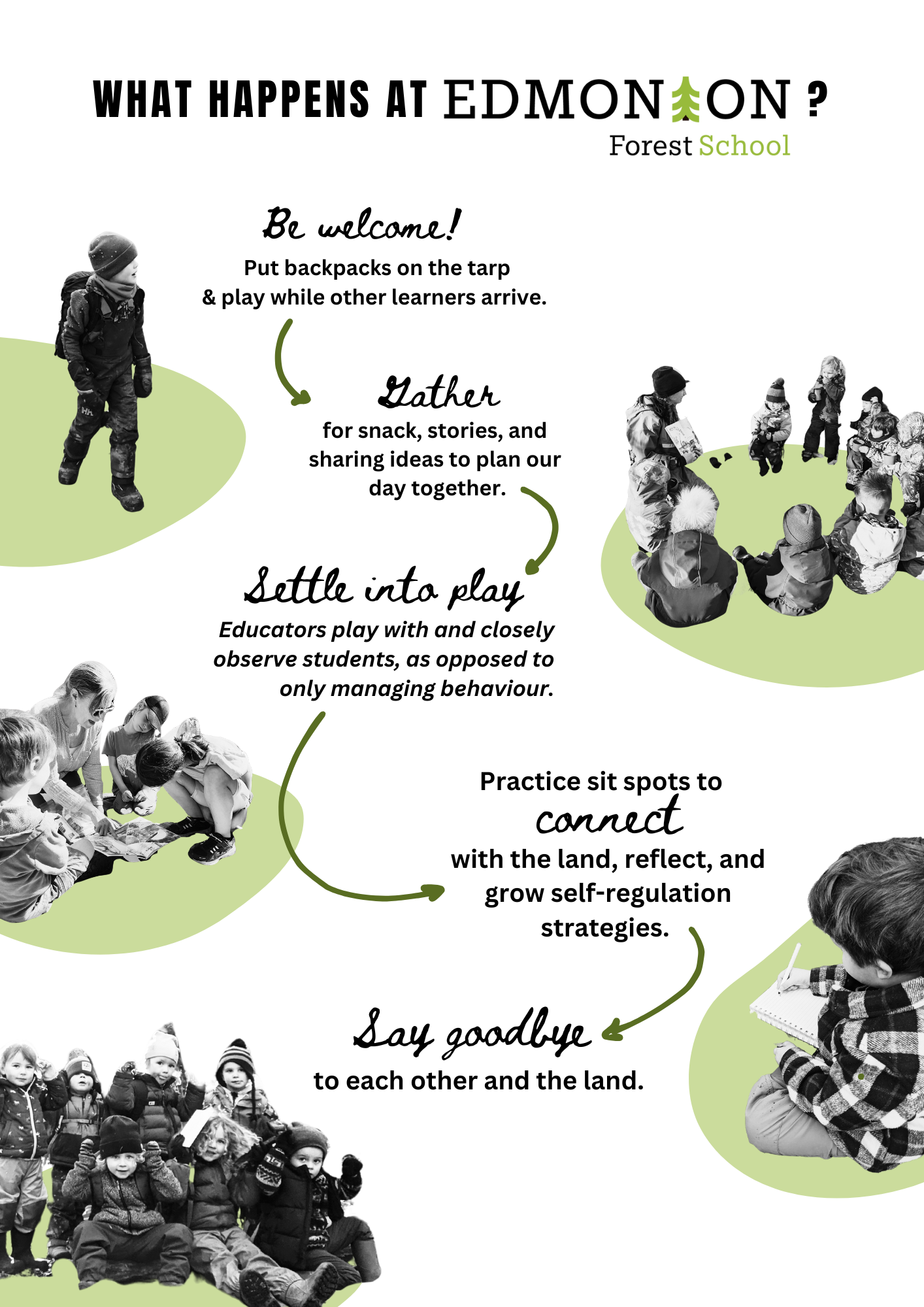 We make a solid plan about how to transition from family time to Forest School time. You can practice this together at the Warmth Workshop so it is ready for Narrow Lake.